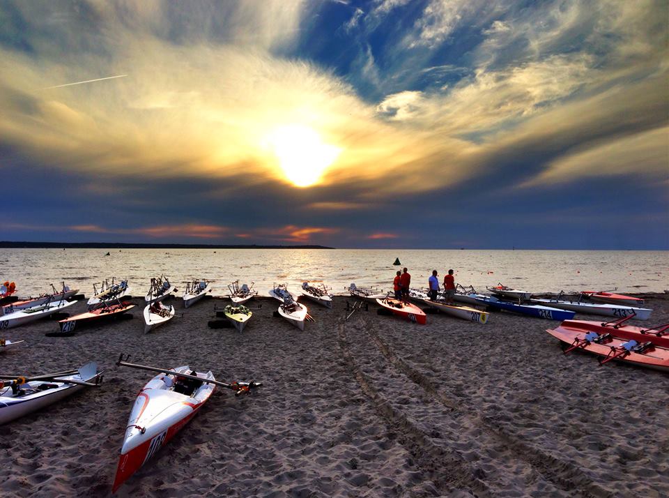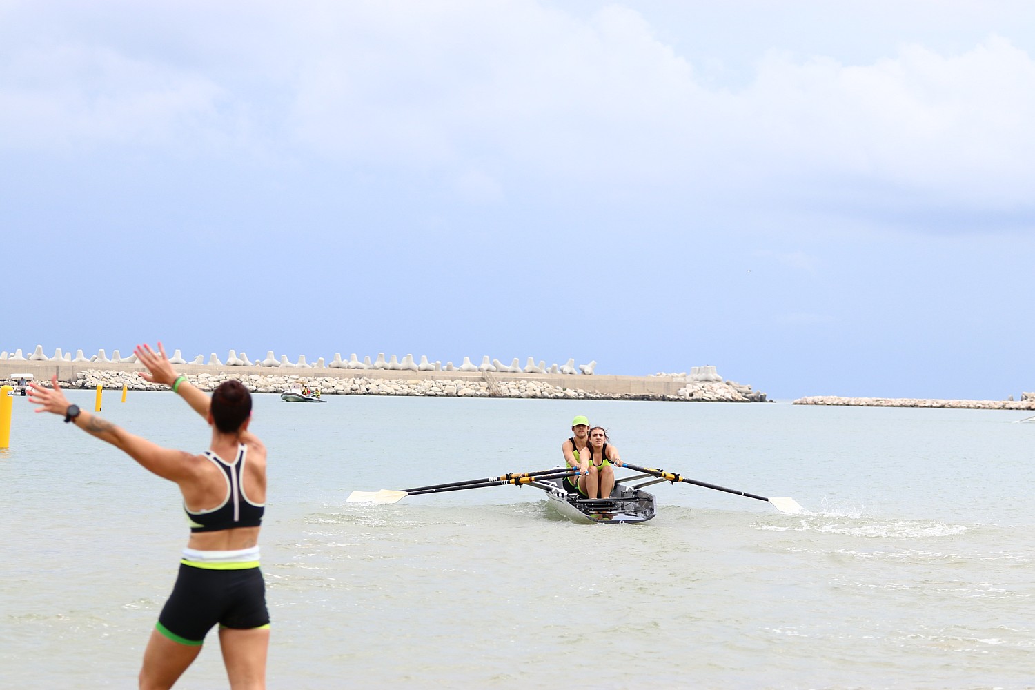 Is a head-to-head elimination style of racing, with a short sprint along the beach, 250m row and a 180-degree turn before rowing back to the beach and sprinting to the finish line.